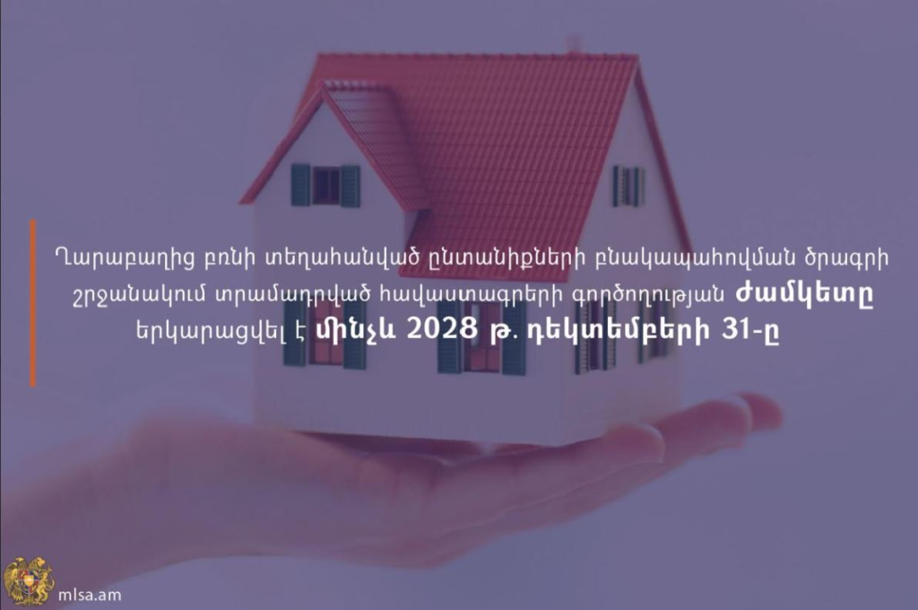 ԼՂ-ից տեղահանված ընտանիքների բնակապահովման ծրագրի շրջանակում տրամադրված հավաստագրերի ժամկետը երկարաձգվել է մինչև 2028-ի դեկտեմբերի 31-ը